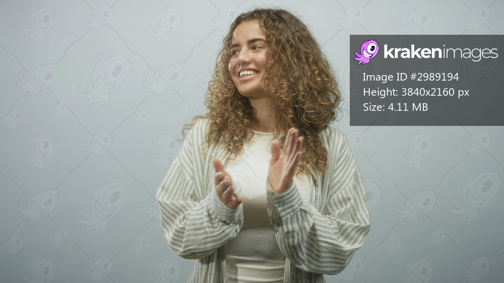 Woman clapping hands and smiling in studio, wearing striped cardigan and white top, casual pose; joy warmth.
