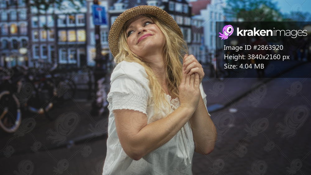 Woman clapping hands and smiling on a cobbled city street wearing straw hat and white blouse; joy gratitude.