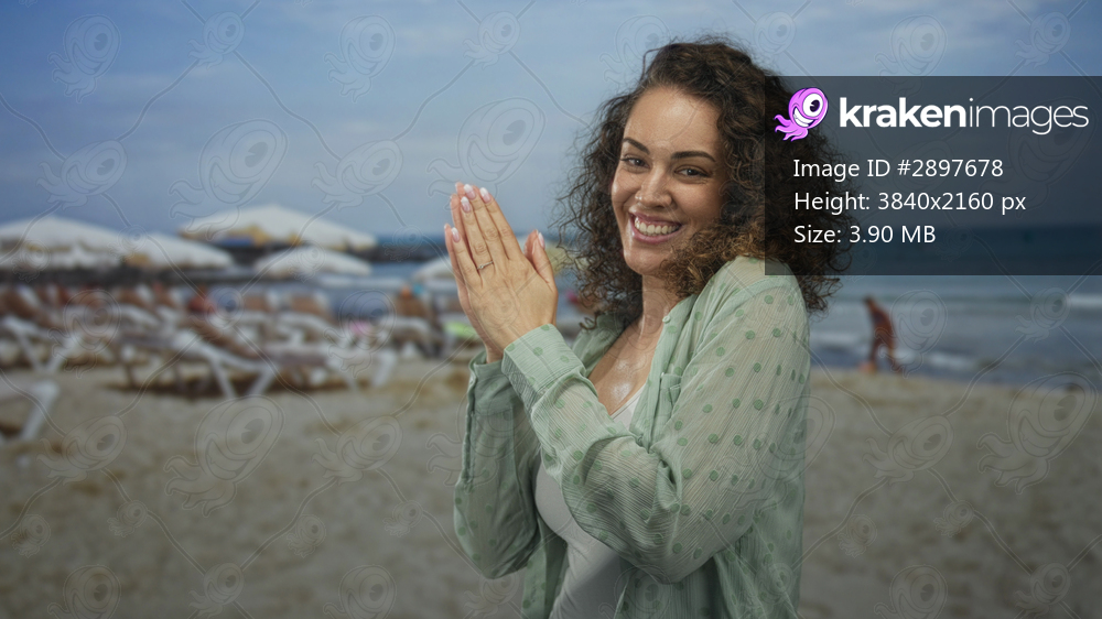 Woman clapping hands and smiling on sunny sandy beach near lounge chairs and umbrellas, wearing green shirt and white tank top; joy carefree.