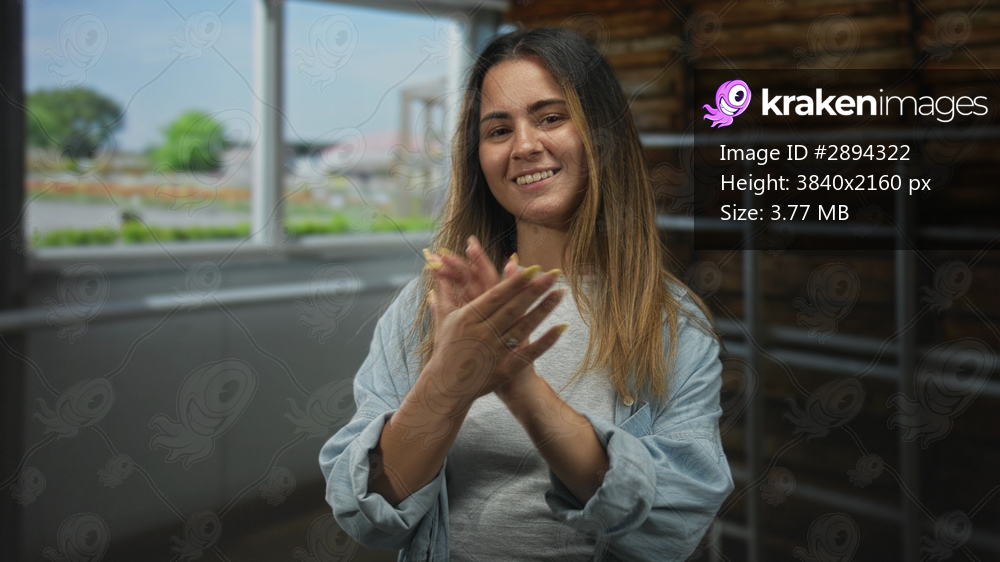 Woman clapping hands together in a well lit indoor studio near a large window and wooden ladder wall, smiling toward camera; joy.