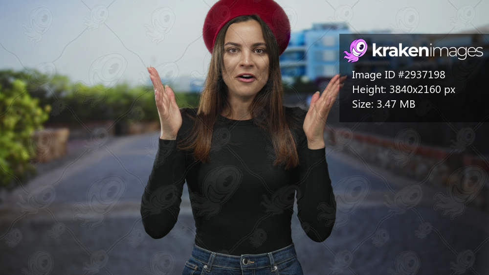 Woman clapping hands wearing a red beret and black shirt on a street with buildings and potted plants visible; surprise anticipation.