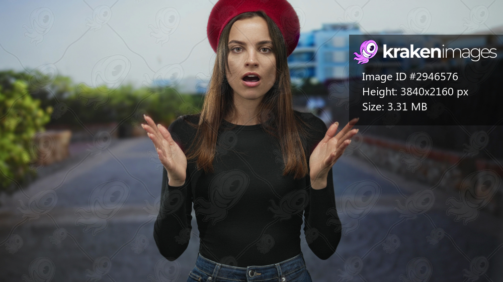 Woman clapping hands wearing a red beret and black shirt on a street with buildings and potted plants visible; surprise anticipation.