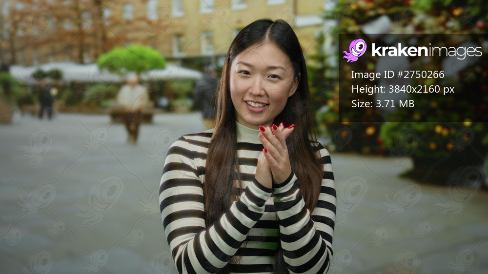 Woman clapping happily in urban street wearing striped shirt surrounded by festive decor and modern cityscape during daytime.