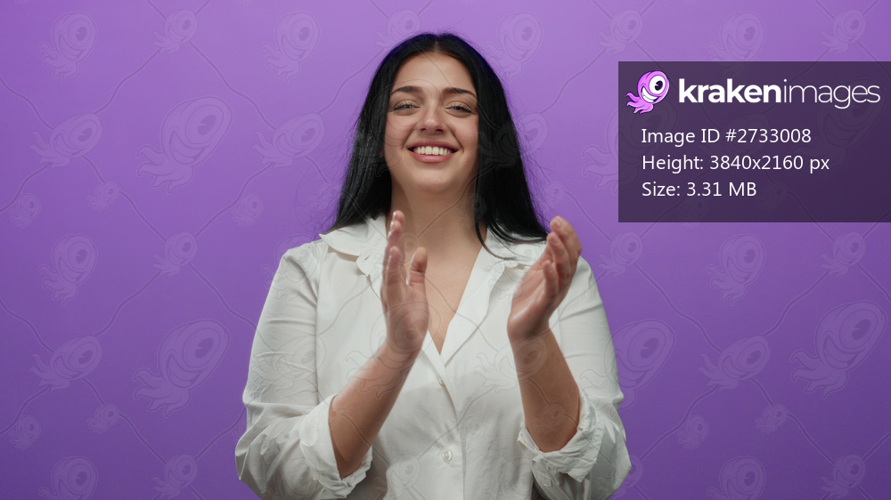 Woman clapping happily over isolated purple background wearing white shirt showcasing plus size confidence and positivity.