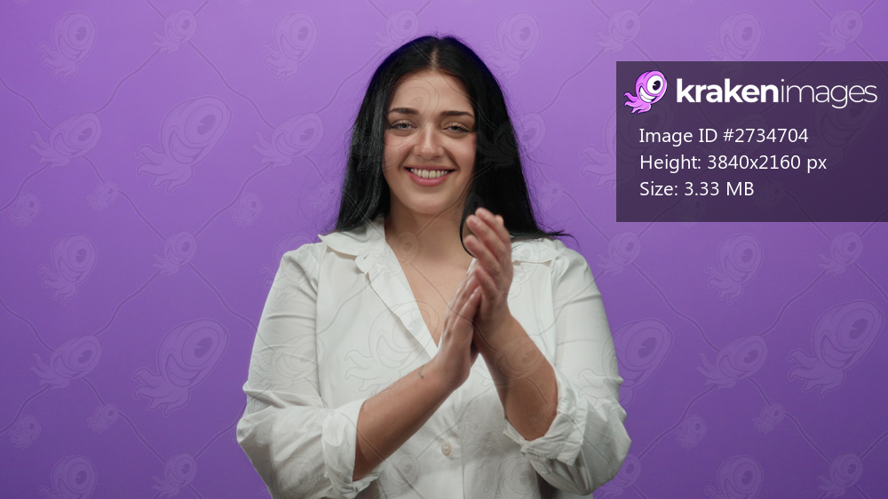 Woman clapping happily over isolated purple background wearing white shirt showcasing plus size confidence and positivity.