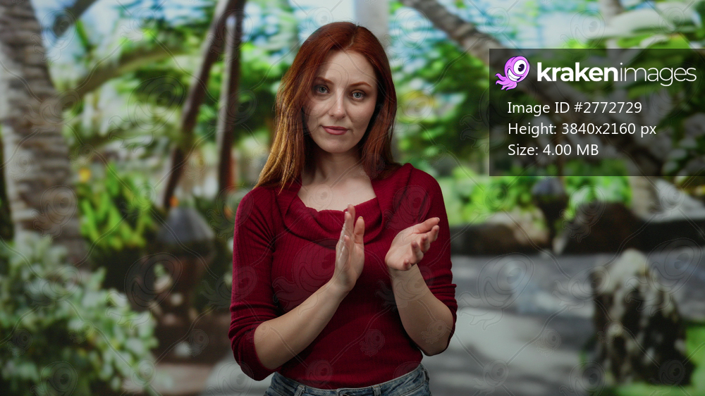Woman clapping in a lush park, wearing a red sweater, surrounded by vibrant greenery, expresses joy and contentment in a tranquil outdoor setting.