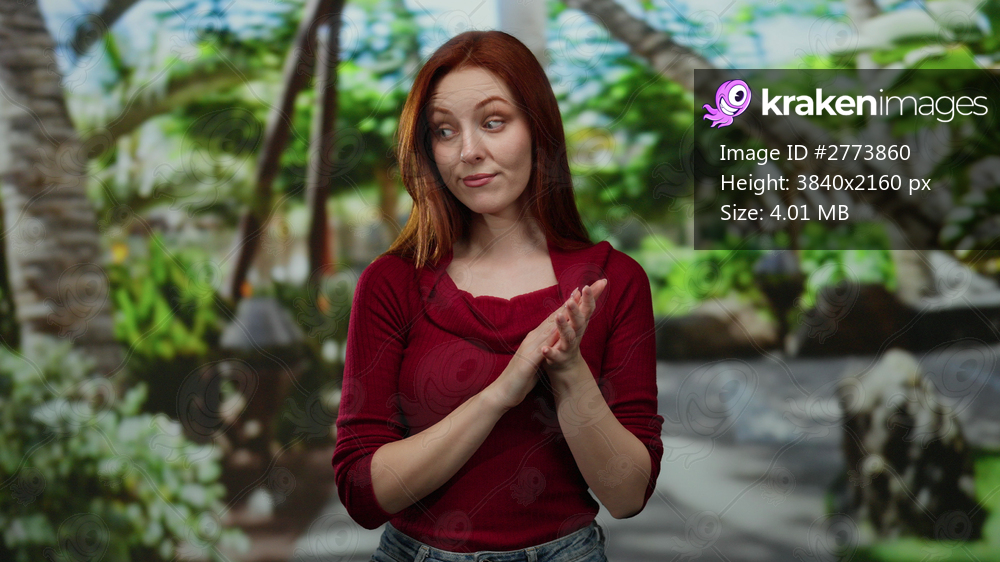 Woman clapping in a lush park, wearing a red sweater, surrounded by vibrant greenery, expresses joy and contentment in a tranquil outdoor setting.