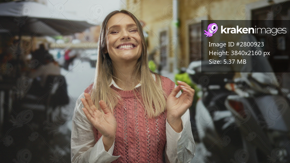 Woman clapping on a city terrace at an outdoor restaurant cafe, smiling amid urban street scene in daytime.