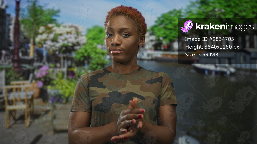 Woman claps hands at sunlit canal street in city lined with houseboats and blooming flowers; determination.