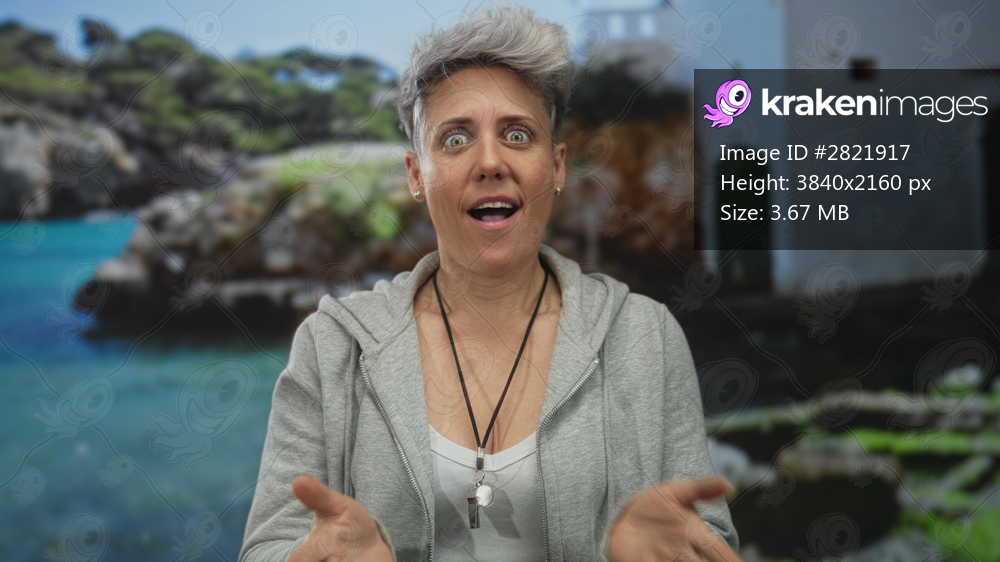 Woman claps hands in studio with seaside backdrop and gray hoodie while smiling broadly at camera and visible necklace pendant; joy.