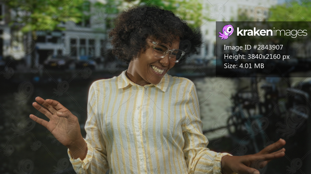 Woman claps hands on a bustling city street by a canal with parked bicycles and leafy trees visible while wearing clear glasses and a striped shirt; joy. - Kraken Images