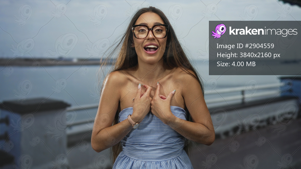 Woman claps hands on street promenade by the seaside, wearing blue strapless dress and glasses; joyful celebration.