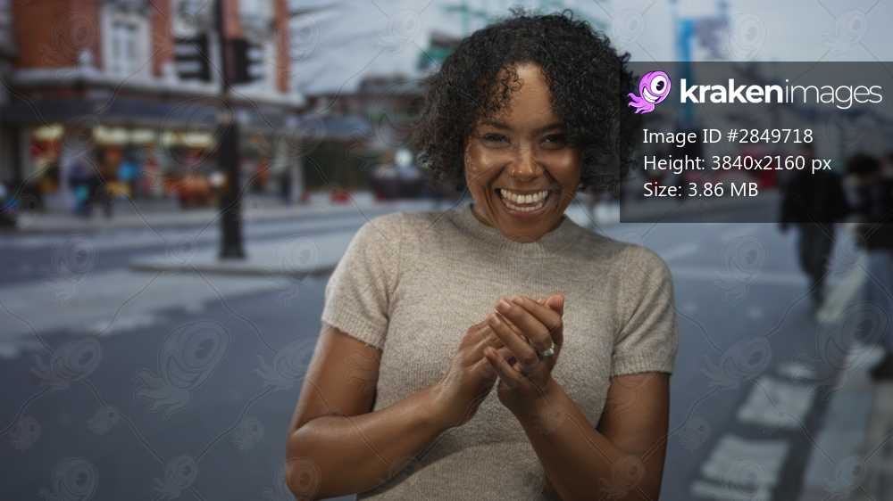 Woman claps hands and smiles broadly while standing on busy downtown city street sidewalk; celebration.