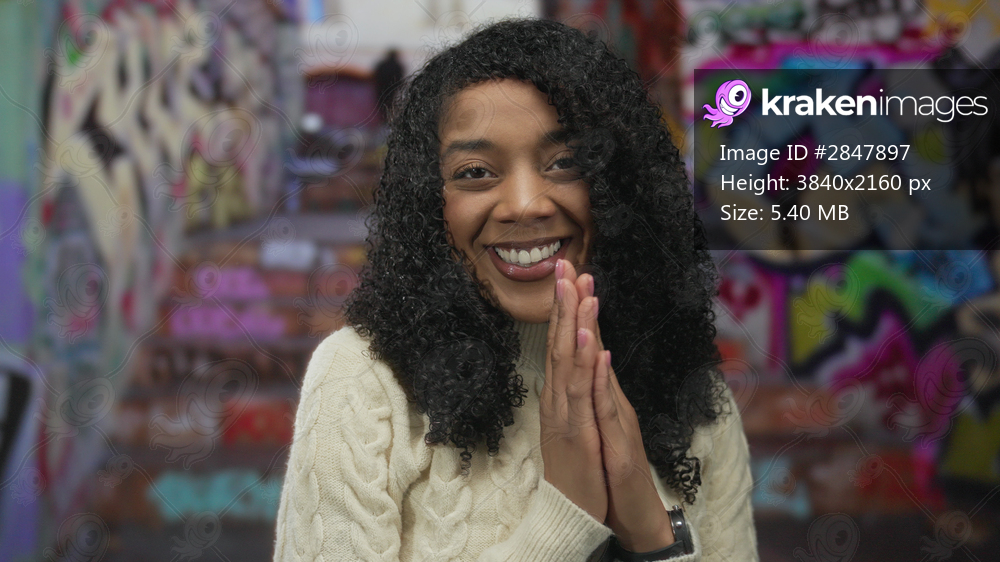 Woman claps hands and smiles in front of colorful graffiti wall on street wearing ivory sweater; joy celebration energy.
