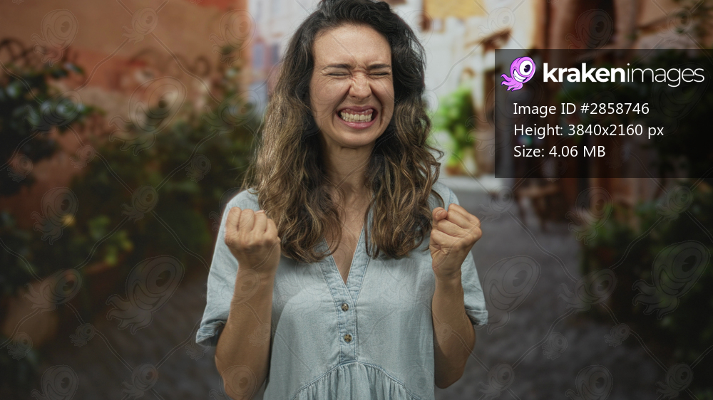 Woman claps hands and smiles with open mouth on sunlit historic cobblestone street; happiness celebration.