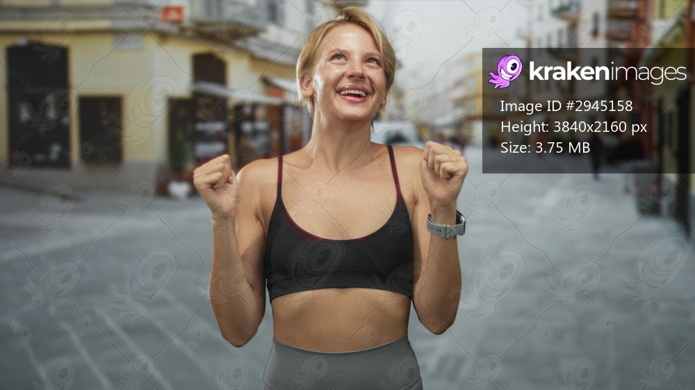 Woman claps hands then pumps fists, smiling with exposed abs in a sports bra on a street lined with shops; joy celebration.