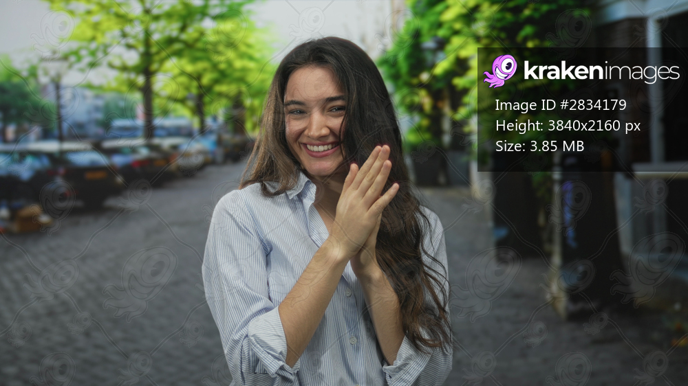 Woman claps hands together in front of chest on sunlit street with parked cars and trees; happiness gratitude.