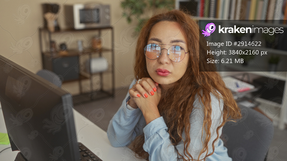 Woman with clasped hands at office desk wearing round glasses by computer monitor, looking up toward camera; thoughtful focus.
