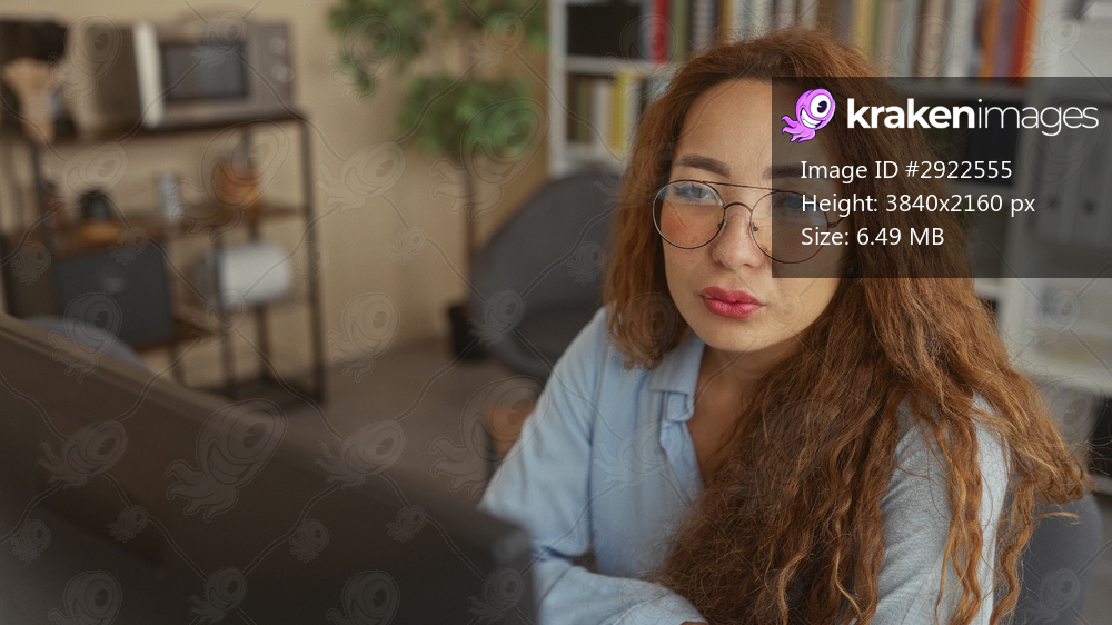 Woman with clasped hands at office desk wearing round glasses by computer monitor, looking up toward camera; thoughtful focus.