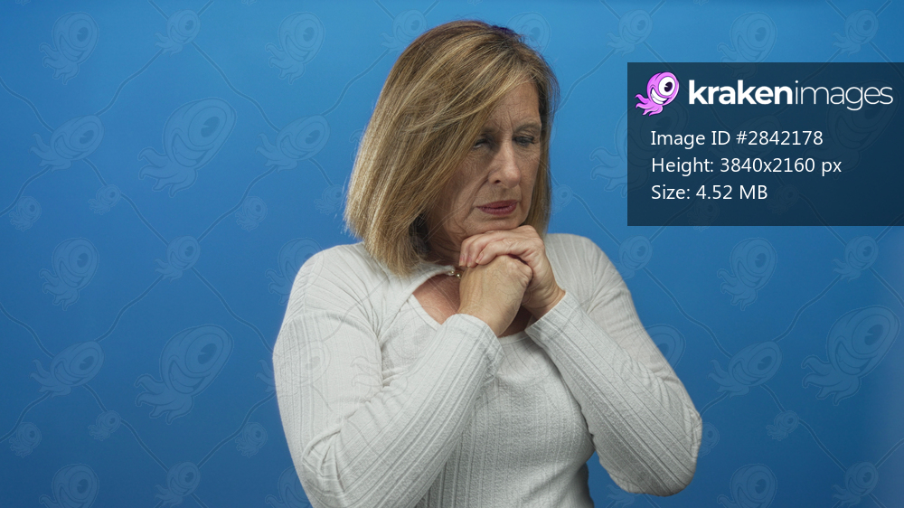 Woman with clasped hands and closed eyes standing against solid blue studio wall; serenity reflection.