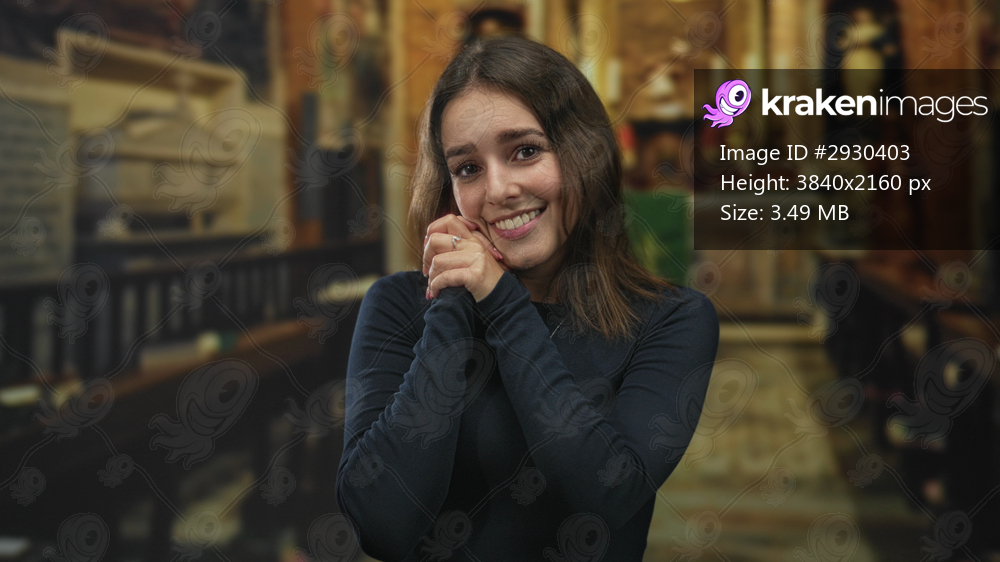 Woman with clasped hands in a church aisle, smiling and leaning slightly forward with fingers interlaced, ring on finger and dark long sleeve visible; devotion hope. - Kraken Images