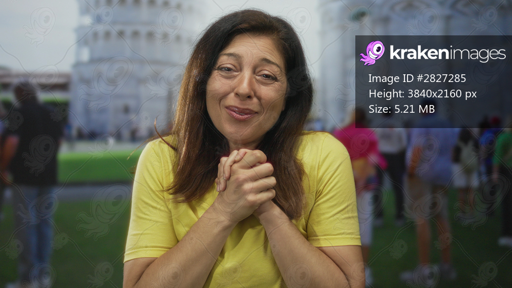Woman clasped hands in front of building landmark with leaning tower visible behind and tourists walking by; hope memory inspiration gratitude.
