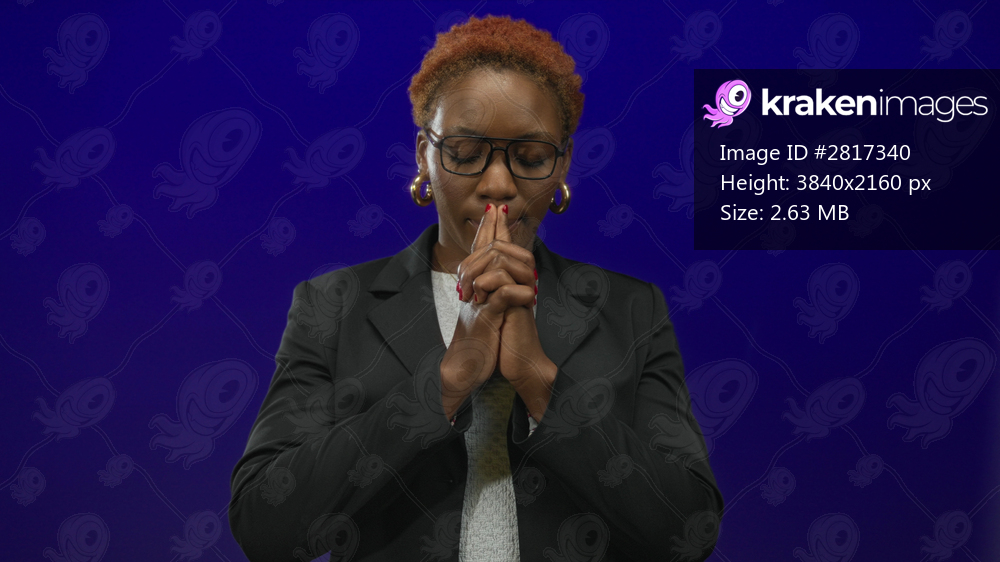 Woman with clasped hands in prayer gesture in a vibrant blue studio scene; faith reflection serenity.