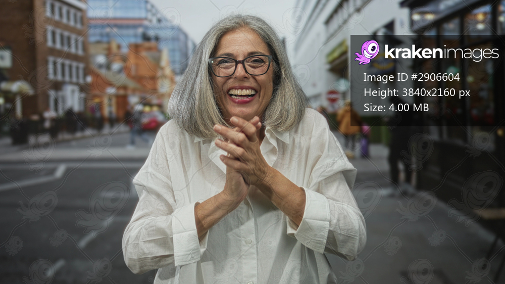 Woman with clasped hands laughing and smiling on street wearing glasses and white shirt; joy celebration warmth.
