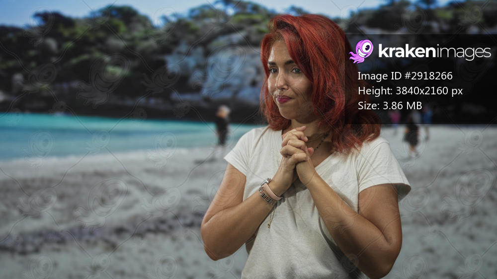 Woman with clasped hands near chest facing camera against studio beach backdrop; quiet contemplation.