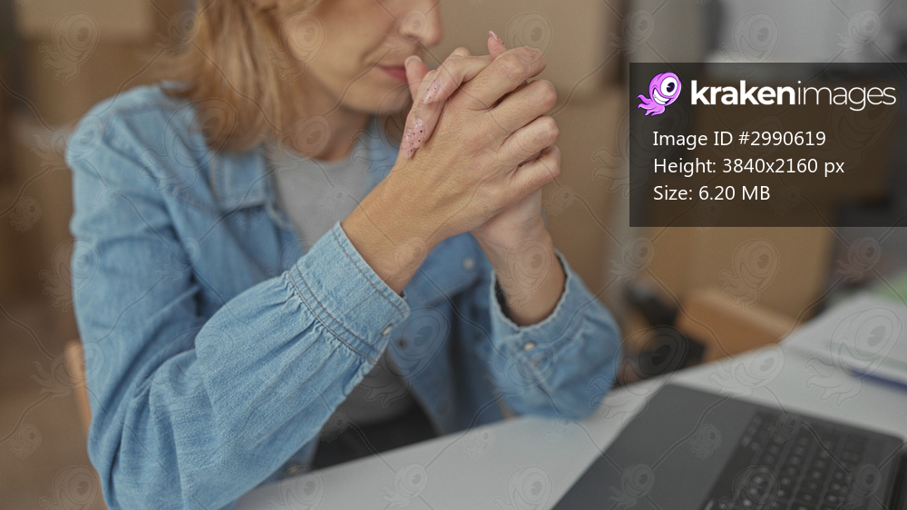Woman with clasped hands over laptop, hands pressed together in a praying gesture amid packed boxes in studio; worry uncertainty.
