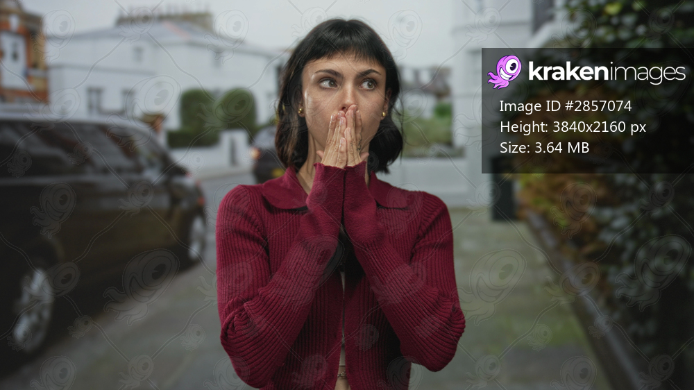 Woman with clasped hands over mouth on urban street near parked car and terraced houses; anxiety concern.
