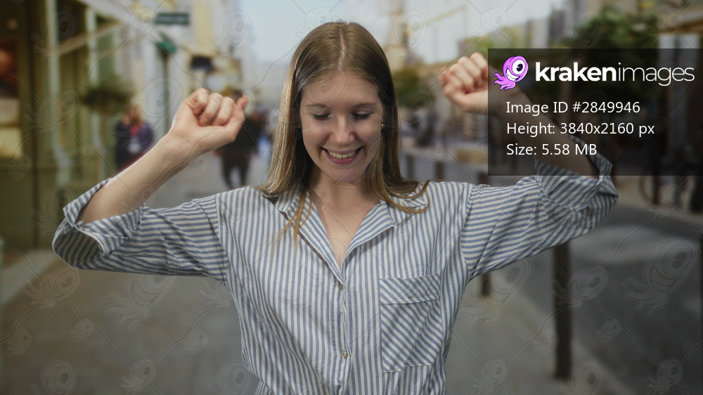 Woman with clasped hands smiling on street wearing striped shirt by storefronts and lampposts on sidewalk under city buildings in daylight; happiness.