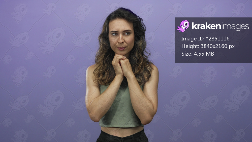 Woman clasping chin and gazing sideways in purple studio; contemplation doubt reflection introspection.