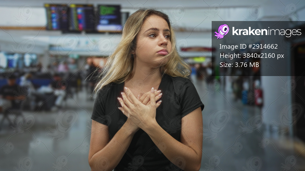 Woman clasping hands at chest in busy airport terminal, blonde young adult in black tshirt looking upward with anxious expression; anxiety waiting.