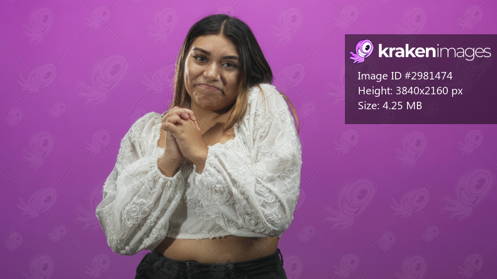 Woman clasping hands with exposed hands and midriff, smiling shyly in studio; contentment self acceptance.