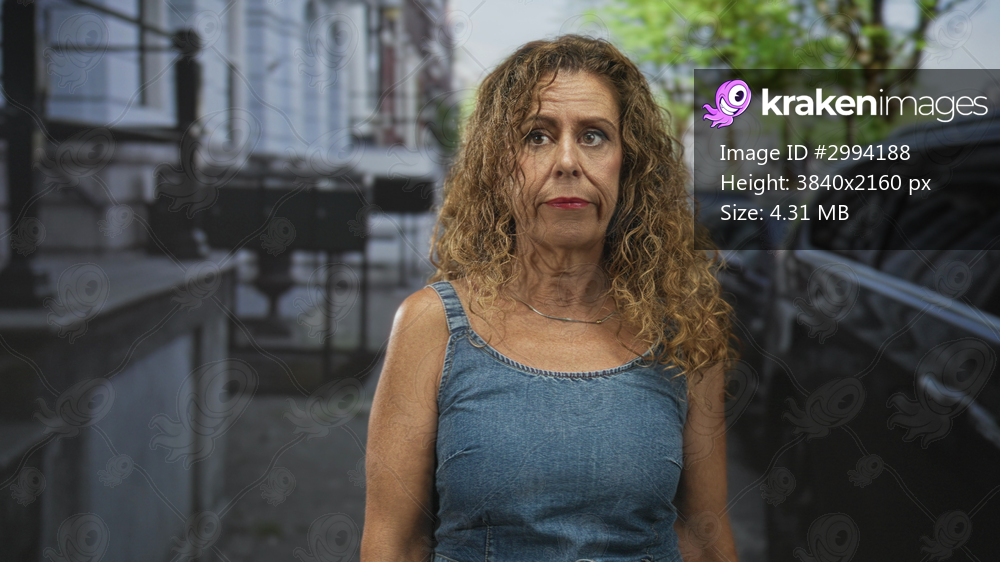 Woman clasping hands and glancing sideways on a city street in denim tanktop, visible face and curly hair; quiet skepticism.