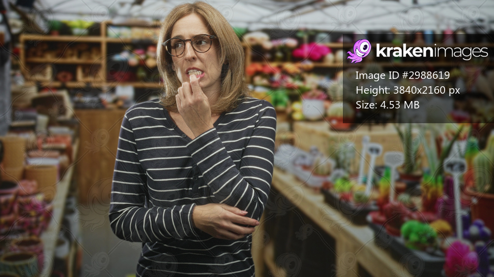 Woman clasping hands in a plant shop building aisle among pots and succulents, wearing glasses and striped sweater; thoughtful reflection.