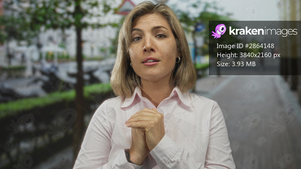 Woman clasping hands in front of chest on cobblestone street lined with leafy trees and wooden benches; hope.