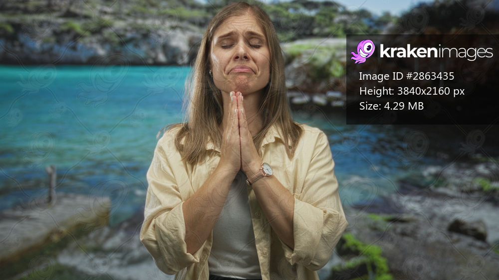 Woman clasping hands in prayer at rocky beach pier with sunlit turquoise water behind, looking upward at sky; hope.