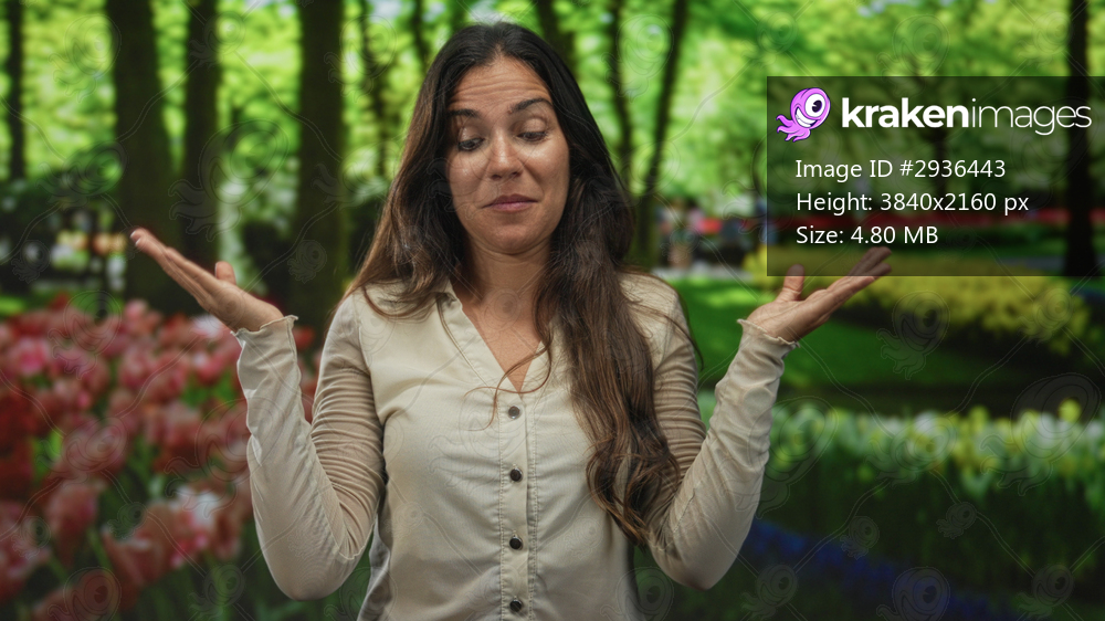 Woman clasping hands near chest with fingers intertwined in forest park among tulip beds and green trees; nervous.