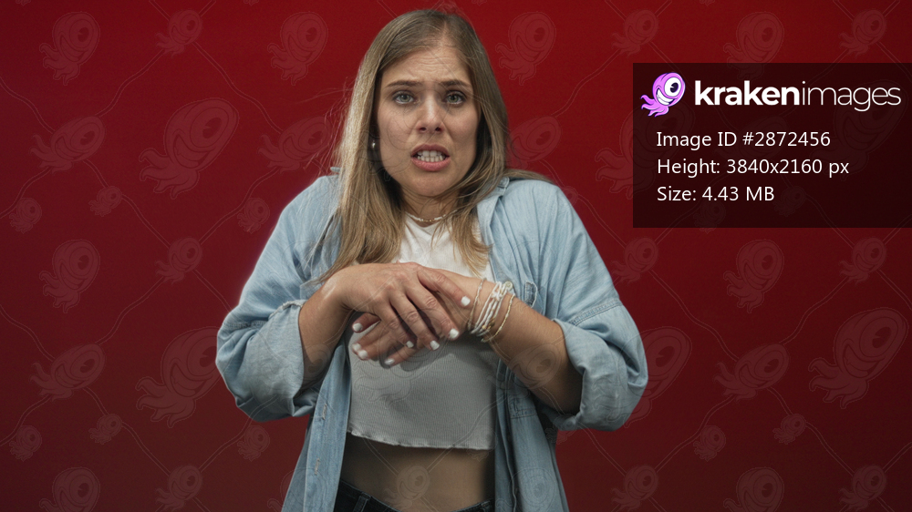 Woman clasping hands near chest in a red studio, wearing denim shirt and white cropped top with visible bracelets and anxious expression; fear.