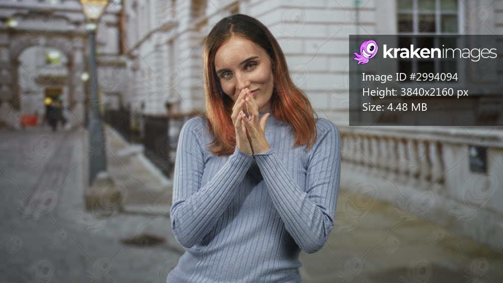 Woman clasping hands near chest on a street beside a stone building, red hair, light sweater and slight smile beneath a lamppost; gratitude.
