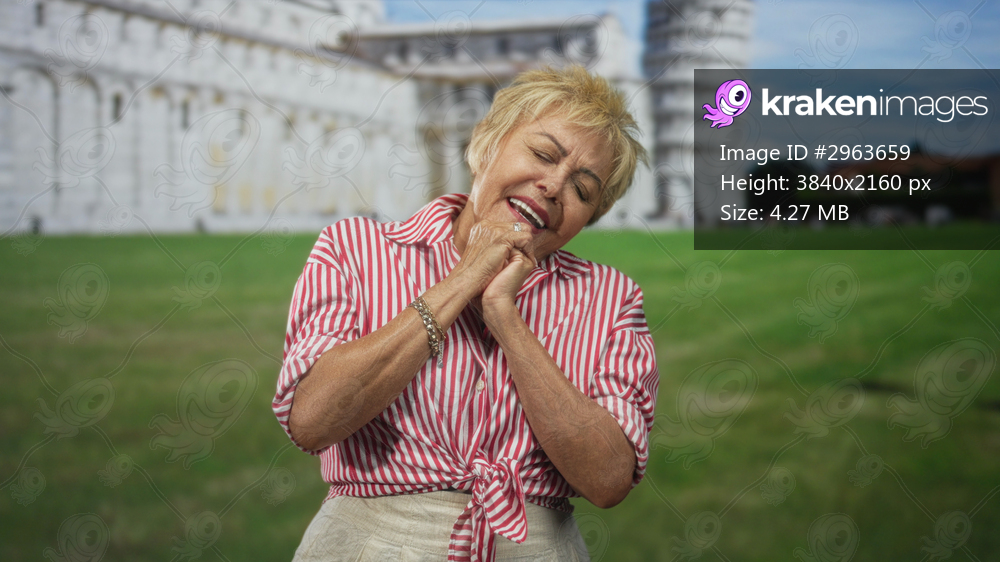 Woman clasping hands near chin, head tilted and smiling in front of a historic building and tower on a grassy lawn; joy travel nostalgia.