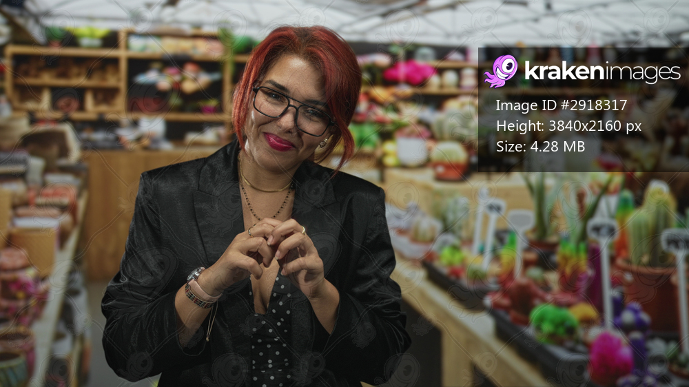 Woman clasping hands near colorful potted flowers in a covered market building stall, wearing glasses and jewelry, smiling gently at camera; community warmth serenity. - Kraken Images