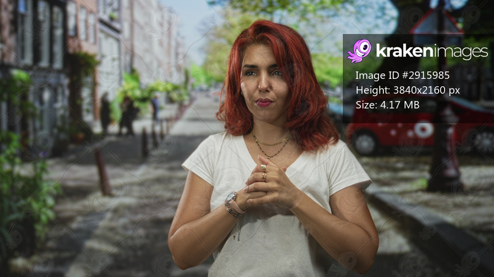 Woman clasping hands over chest on a sunny city street in a white t shirt with red hair and layered necklaces, parked car and row houses visible; concern. - Kraken Images