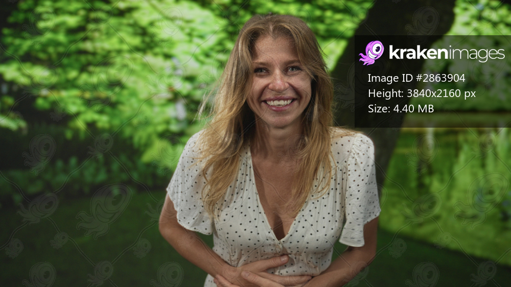 Woman clasping hands and smiling at camera in forest setting by a green pond wearing white polka dot dress; joy contentment.
