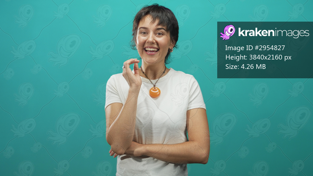 Woman clasping hands and smiling with orange pendant on white tshirt in studio teal backdrop; playful storytelling.