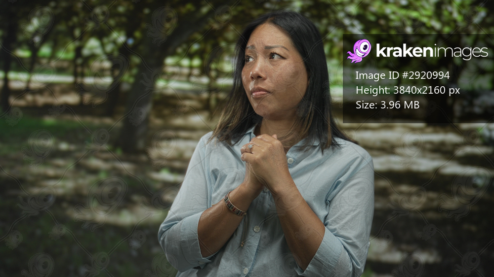 Woman clasping hands to chest in park with green trees and dappled sunlight, wearing ring on finger; hope prayer.