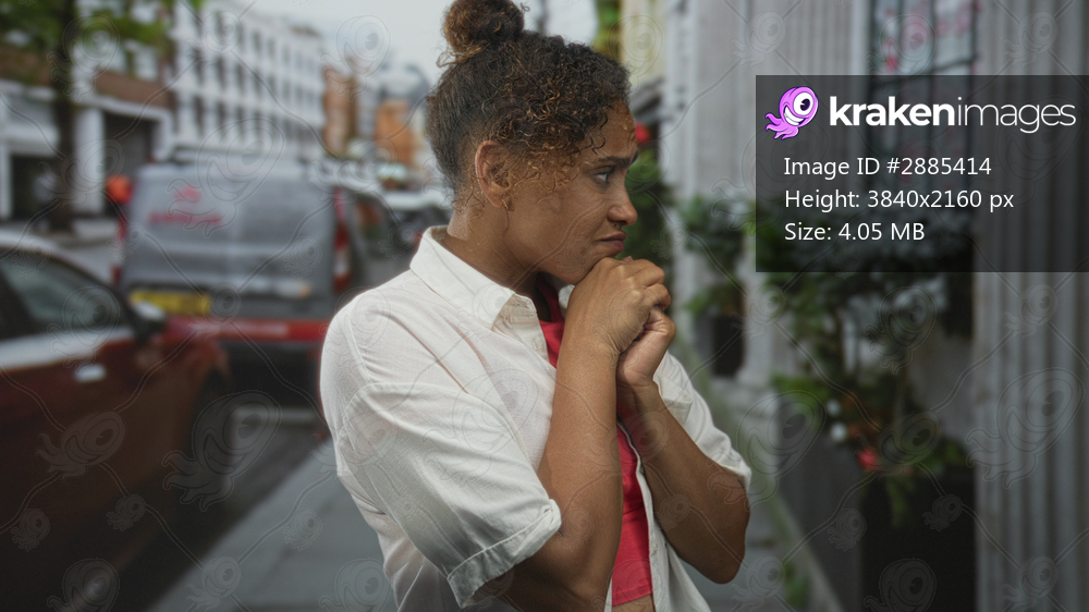 Woman clasping hands to chest on a busy city street, eyes closed and lips pursed, white shirt and red top visible; pleading hope.