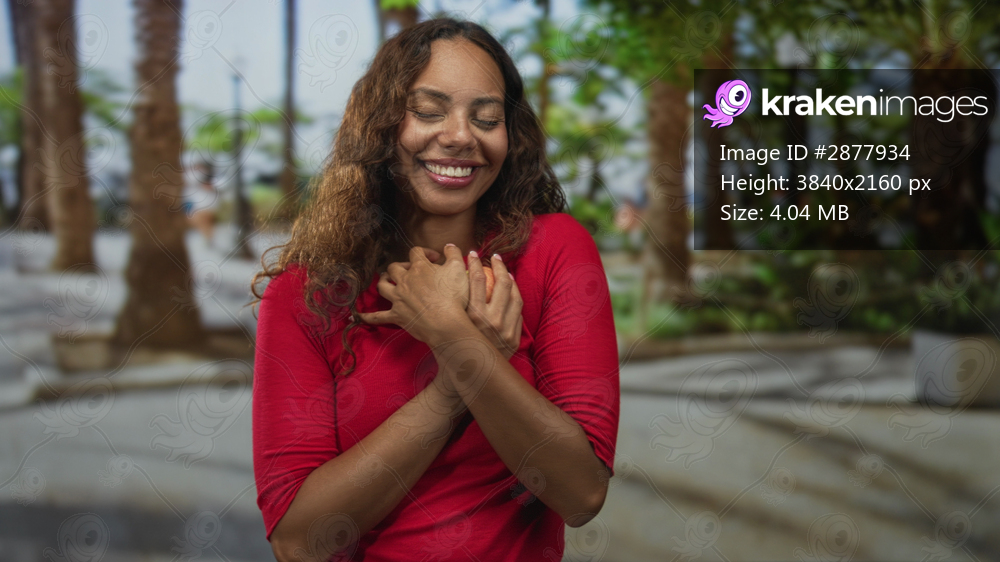 Woman clasping hands to chest on a palm-lined street, smiling with closed eyes while wearing a red shirt and curly hair; gratitude.